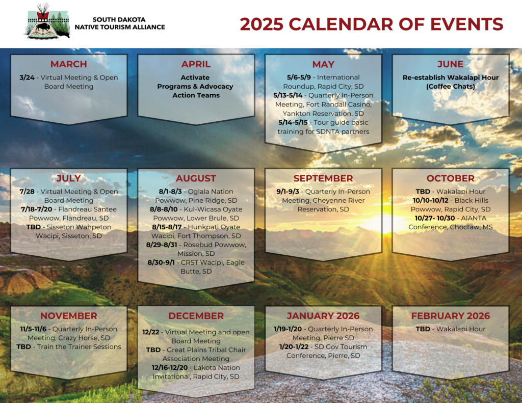 The SDNTA wecomes people from all backgrounds and communities to come together and support the responsible development, management and promotion of Native American tourism in South Dakota. Learn more about ways to engage and support our work.